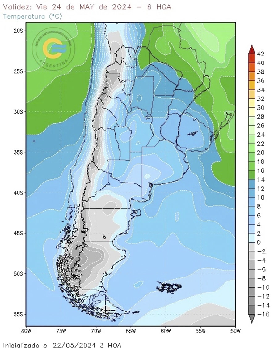 Se espera que el aire muy frío continúe progresivamente su desplazamiento hacia el norte, afectando a todo el país entre el jueves 23 y el viernes 24 de mayo.